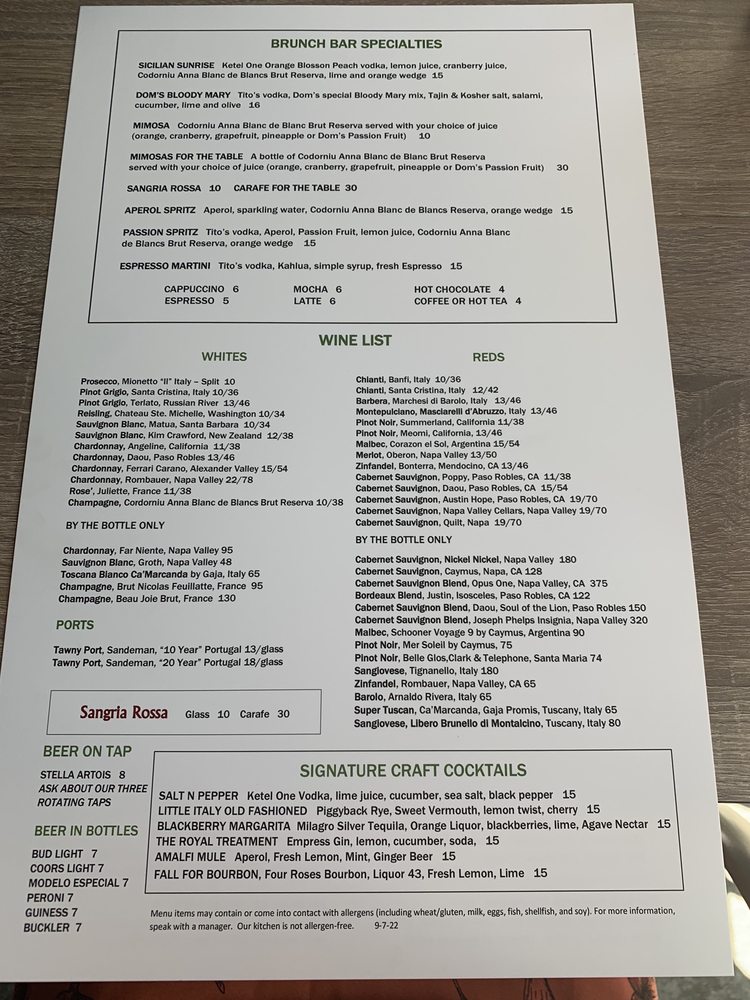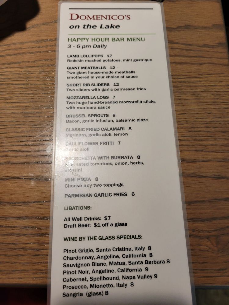 Introducing the menu at Domenicos on the Lake, an Italian restaurant located in Mission Viejo, CA, showcasing a variety of signature salad entrees like Antipasto Salad and Apple Walnut Cranberry Salad. Their appetizers include Baby Scampi, Bruschetta with Burrata, Brussels Sprouts, and Giant Meatballs. For soups, they offer Minestrone and Tomato Bisque. Customers rave about the friendly staff and delicious food, with standout dishes like the Potato Gnocchi and prime rib. The restaurant offers a relaxed yet upscale ambiance with outdoor seating overlooking the lake. A must-try for Italian food enthusiasts looking for a memorable dining experience.